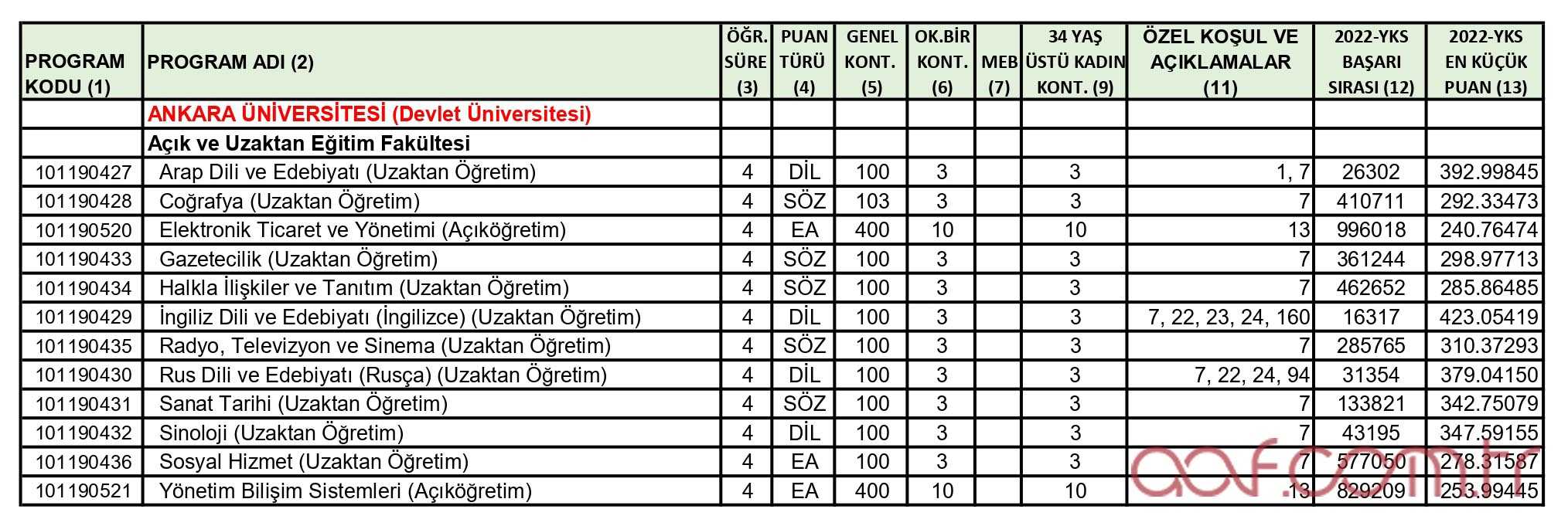 2023 AÖF Taban Puanları ve Kontenjanları